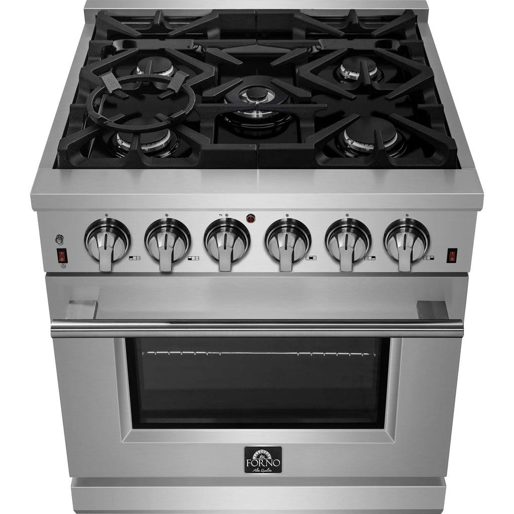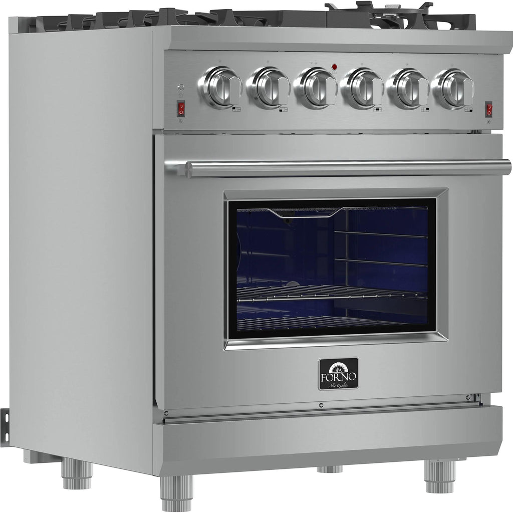 The 30" Forno All Gas Range brings professional styling and Performance into your home kitchen with its durable and beatiful 304 grade stainless-steel design. Cooking surface has 5 sealed burners with a total output of 68,000 BTU including 1 sealed dual-ring burner for simmering melting chocolate or cooking sauces, 20K dual-ring burner for boiling or searing and is able to perform simmering like melting chocolate or sauces, Continuous cast iron grates allowmaximum stability of cookware mobility over a recessed enamel Cooking surface cavity which keeps spills and splashes contained and easy to clean. This 4.32 cu.ft. convection fan oven has an impressive blue enamel interior, allowing for easy cleaning. The 3-layer glass oven door window provides both heat retention and an unobstructed view. This oven also boasts a total output of 26,000 BTU, providing plenty of power for baking, roasting, and broiling. Included are 2 fully telescopic easy access stainless steel oven racks, concave Wok Ring and LP conversion kit. Additionally, zinc coated metal knobs with bezel rings will maintain their beauty for years. The 6239 series is limited distribution. All FORNO products come with a 2 year warranty.