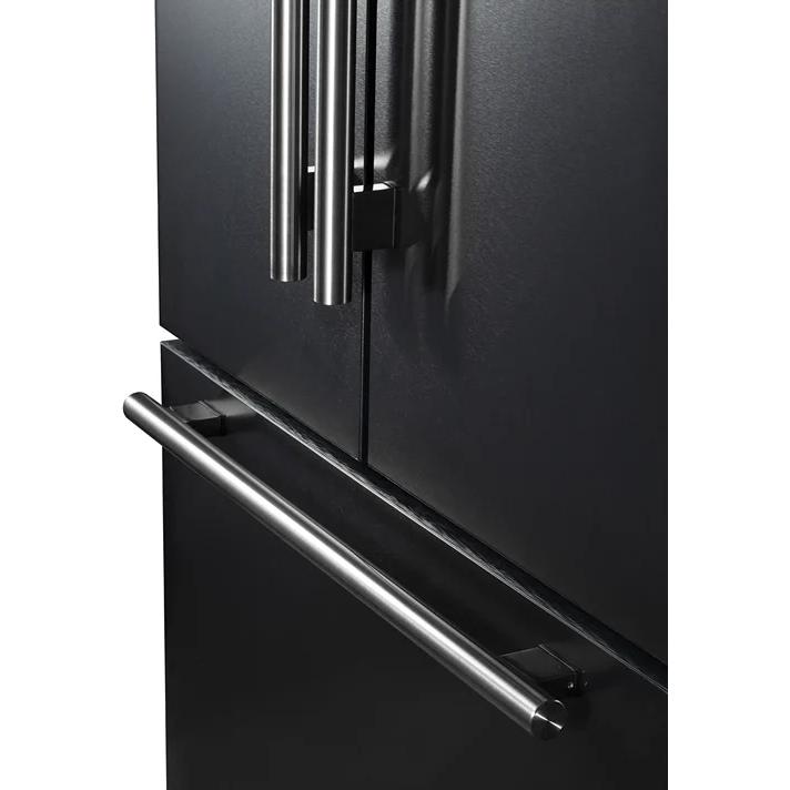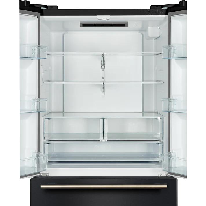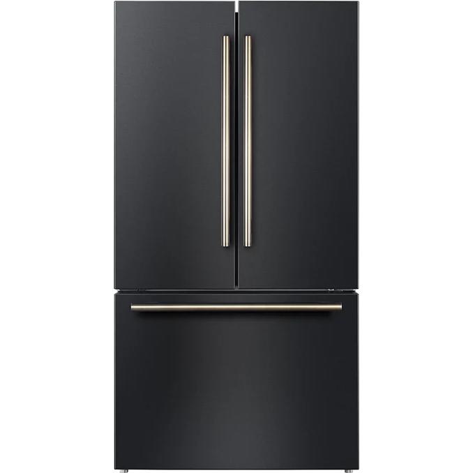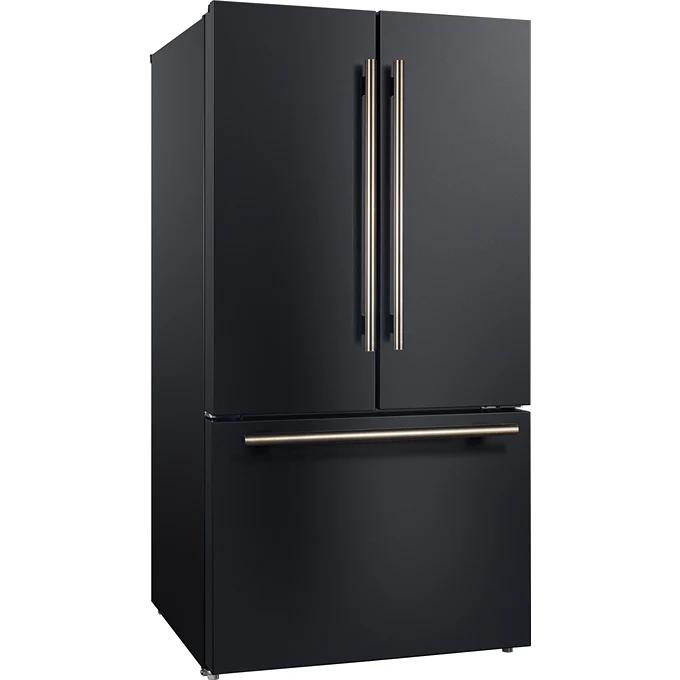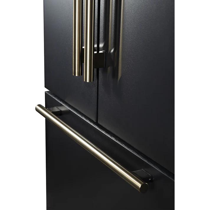 The Rivello 36-Inch French Door Refrigerator in Black with Antique Brass handles offers spacious, energy-efficient cooling with a bold, smudge-resistant finish. The adjustable fresh food shelves and transparent door bins make it easy to organize your groceries, while the internal water dispenser and filtered ice system deliver convenience without cluttering the exterior. A full-width freezer drawer with removable ice bin and fast freeze function keeps frozen foods accessible and fresh. This automatic defrost, frost-free fridge is Energy Star certified and built for freestanding installation, making it a practical choice for modern kitchens.