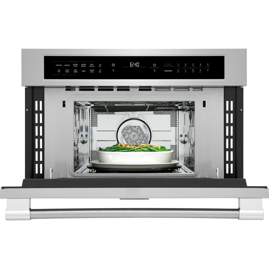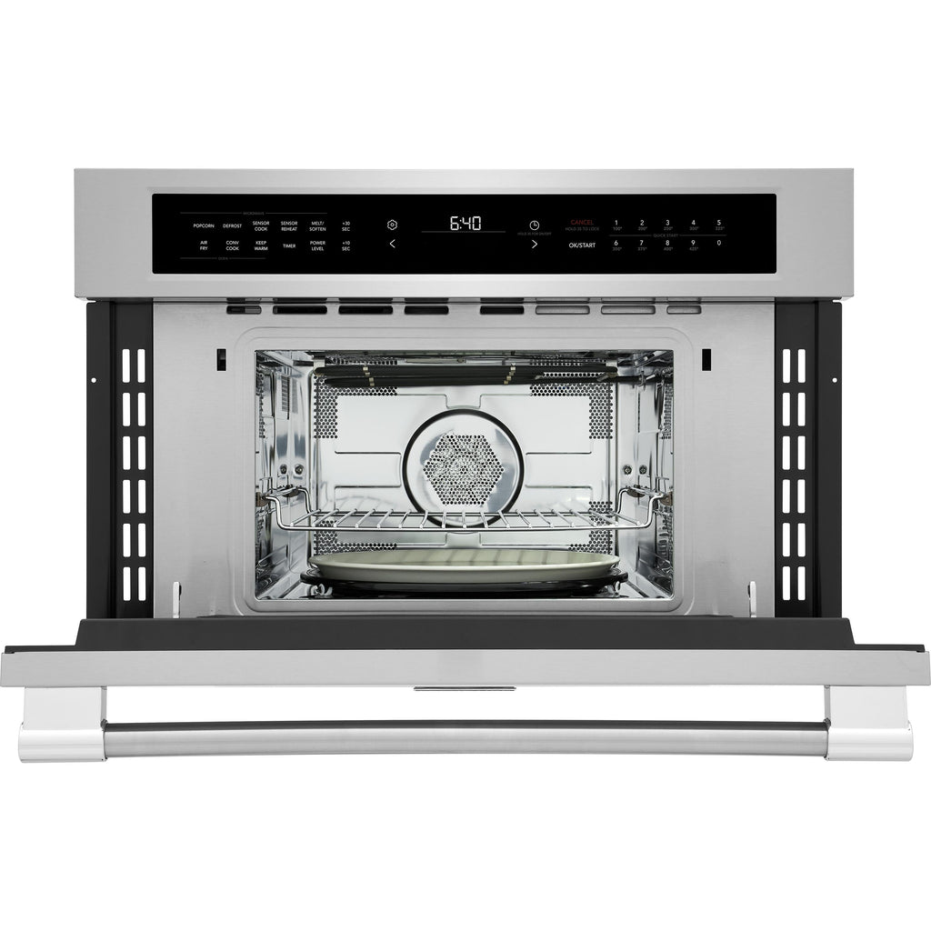 The Frigidaire Professional Built In Drop Down Door Microwave with Air Fry allows you to make crispy delicious meals with little to no oil, along with a powerful, 1700-Watt convection system for even heat distribution and perfectly cooked dishes. Sensor Cooking options provide effortless temperature control, while bright LED interior lighting makes it easier to see what's cooking inside of the microwave. Finished in Smudge-Proof Stainless Steel, it offers a sleek, modern look that resists fingerprints.