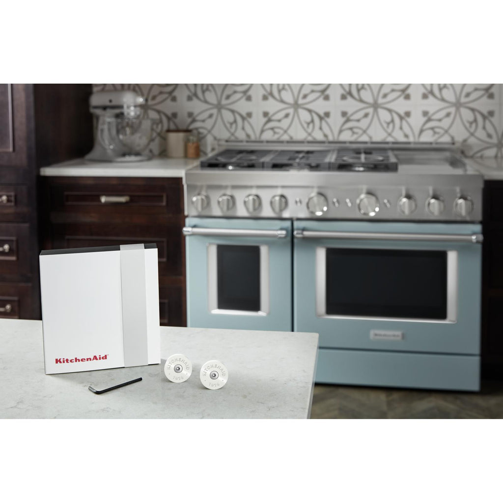 This KitchenAid® Commercial-Style Range Handle Medallion Kit, Mascarpone, lets you change the color of your handle medallions to add a custom accent. The kit includes 2 mascarpone medallions and a 1/8 hex allen wrench for easy replacement. Order one medallion kit per range handle. Installation of these handle medallions requires basic hand tools and novice repair experience.