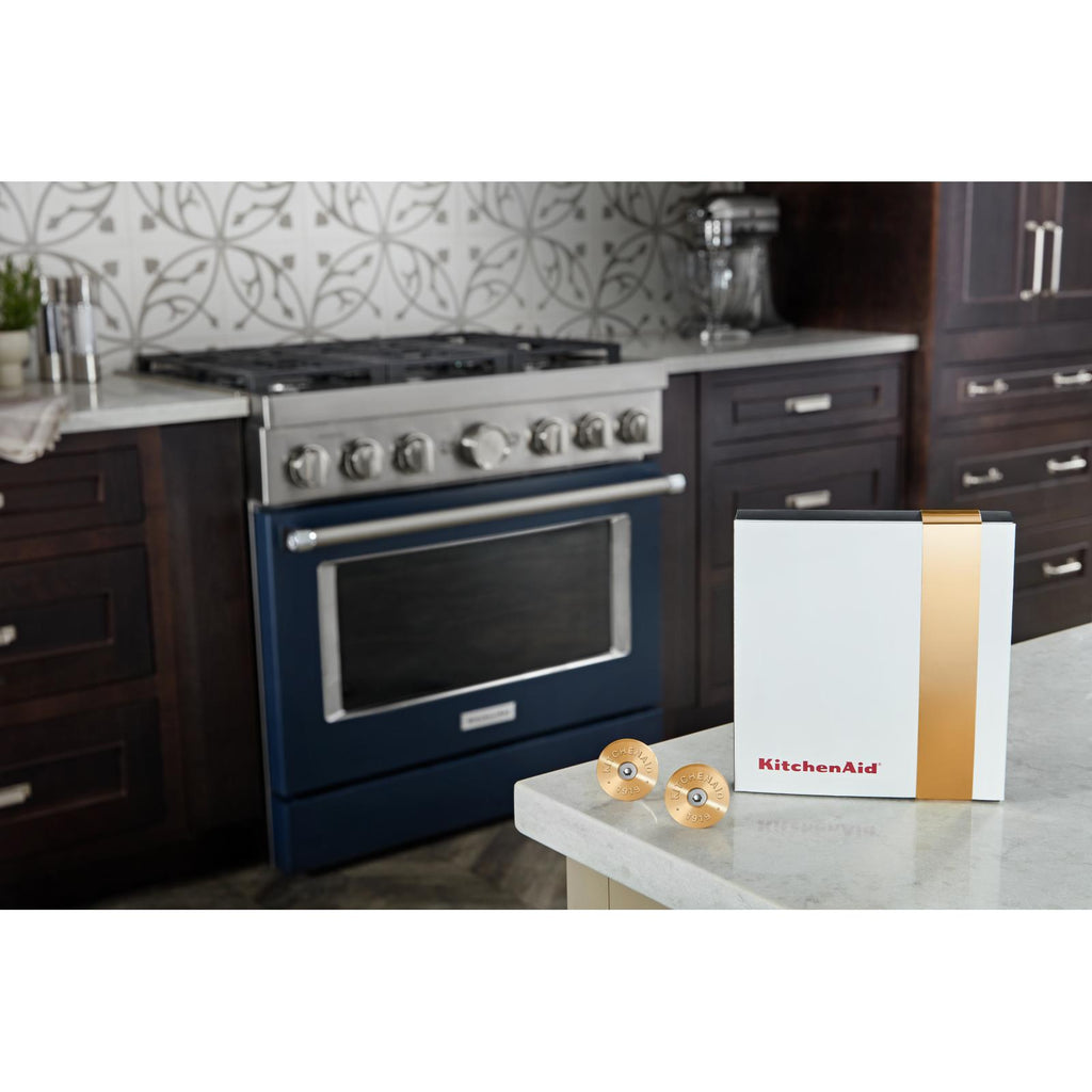 This KitchenAid® Commercial-Style Range Handle Medallion Kit, New Gold, lets you change the color of your handle medallions to add a custom accent. The kit includes 2 new gold medallions and a 1/8 hex allen wrench for easy replacement. Order one medallion kit per range handle. Installation of these handle medallions requires basic hand tools and novice repair experience.
