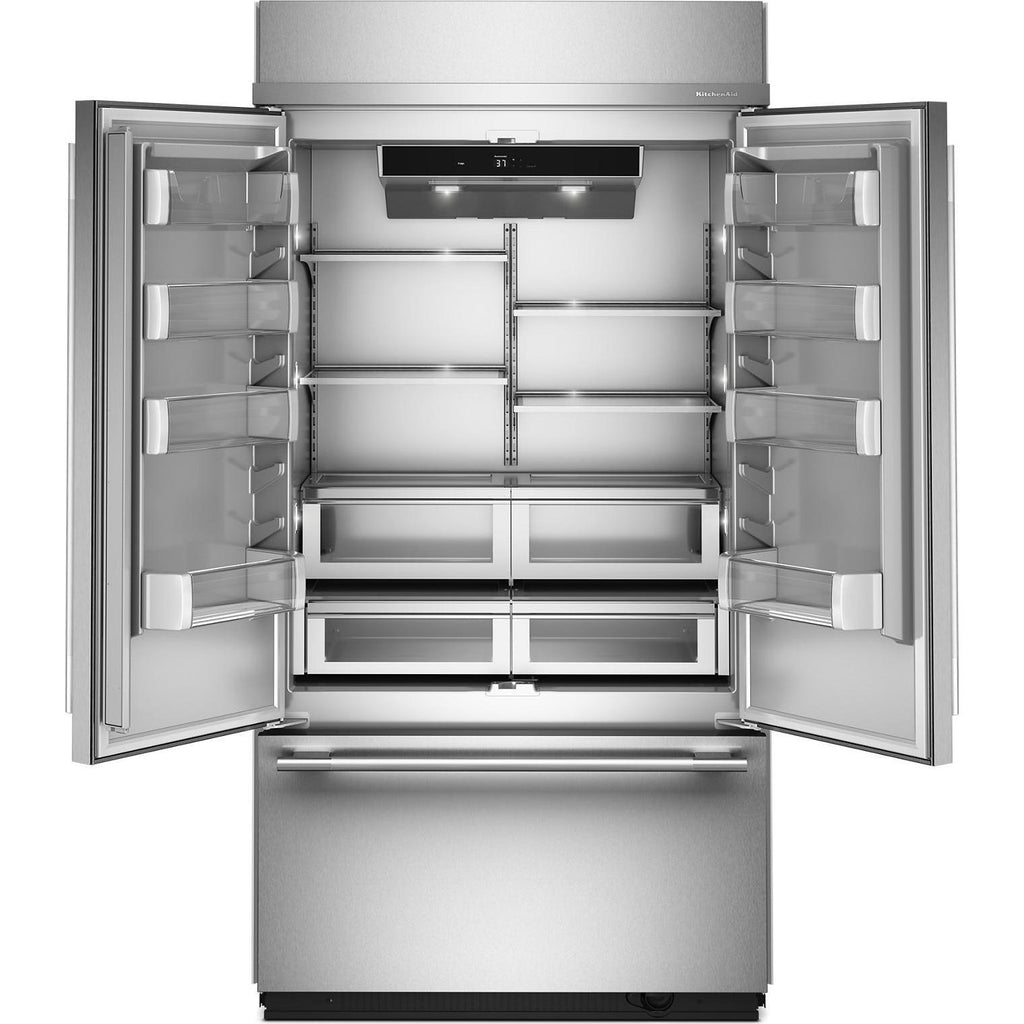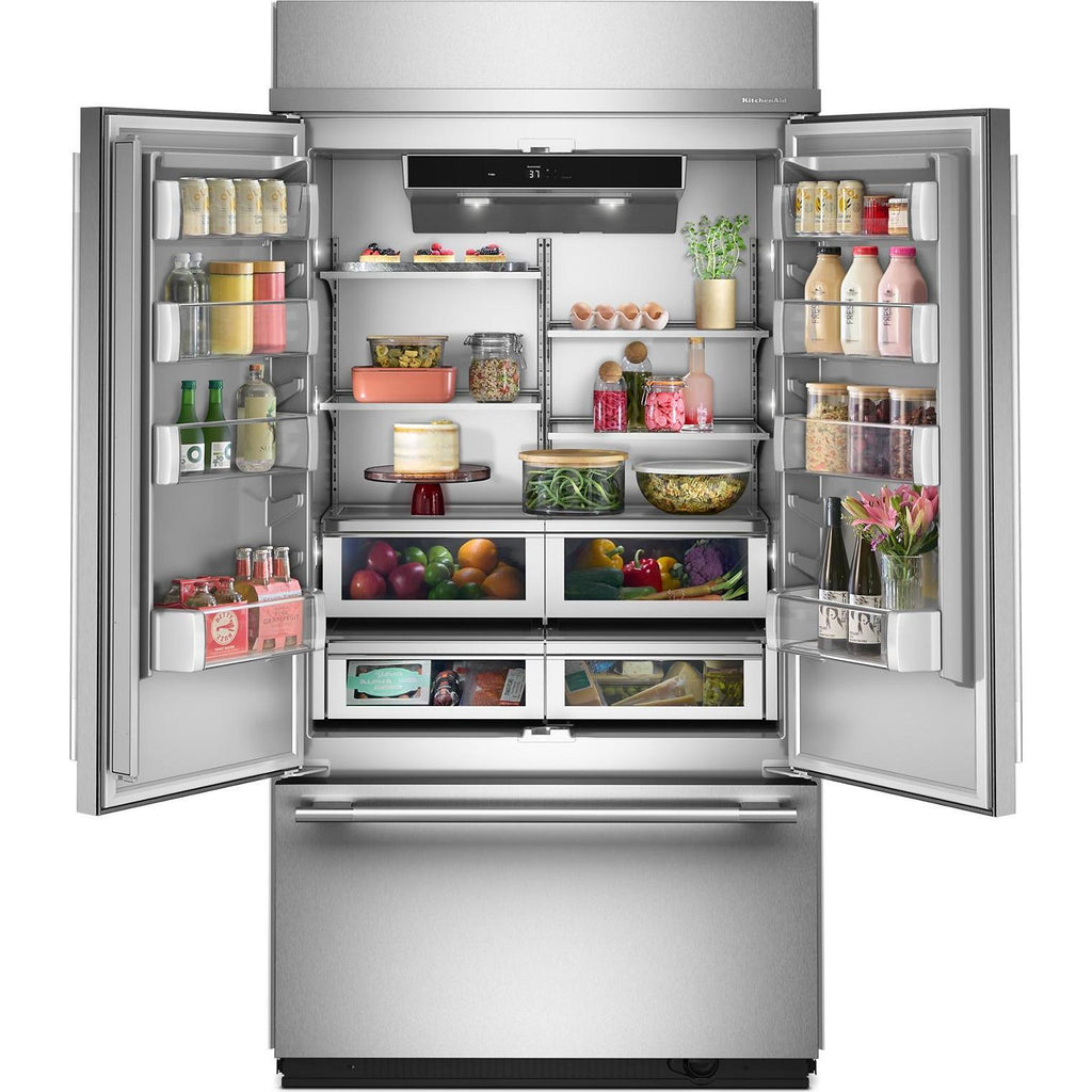 This Built-In French Door Bottom Mount Refrigerator elevates your style with a PrintShield™ finish exterior color and option to upgrade with customizable hardware. Multiple Installation Options allow you to choose between flush installation for an integrated look or proud for a prominent look. Signature Platinum Interior wows with metallic accents. Preserva®+ Cooling System has multiple evaporators to keep your food fresh.