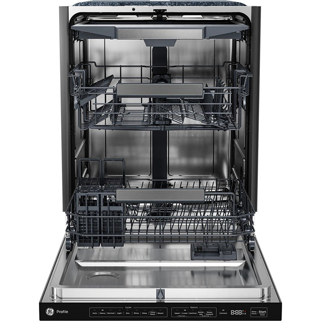 Lave-vaisselle intérieur en acier inoxydable à baignoire haute GE 24" Top Control avec ouverture automatique et sèche, 47 dB. Ce lave-vaisselle avec une grille glissante lisse rend le chargement et le déchargement fluides et simples. Le porte-bagages s’ajuste vers le haut ou le bas pour accueillir des objets plus hauts et s’étend facilement sur des roulements à billes en acier inoxydable, ce qui permet de gérer facilement même les charges les plus lourdes.
